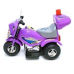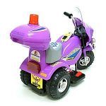 | Cool police motorcycle design with working headlights, turn signals, brake lights and police light. A Rear storage compartment keeps any small items your kids might want to carry with them. This motorcycle is equipped with forward and backward capabilities along with a foot operated gas pedal. Some assembly required. | |